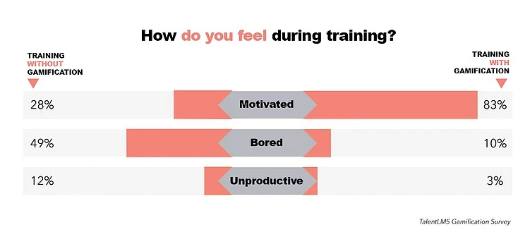 Here you can see a small infographic from the TalentLMS survey about gamification, where two groups of participants answer the same questions. Participants were asked how they felt during the training. This survey also showed that the manager’s concern that gamification would distract employees from training or work is unfounded. The survey shows that 89% of employees believe that they would be even more productive if a number of tools with game elements were available, such as collaboration or internal communication tools that could be used to evaluate the work of colleagues.